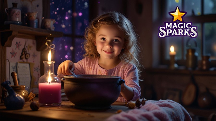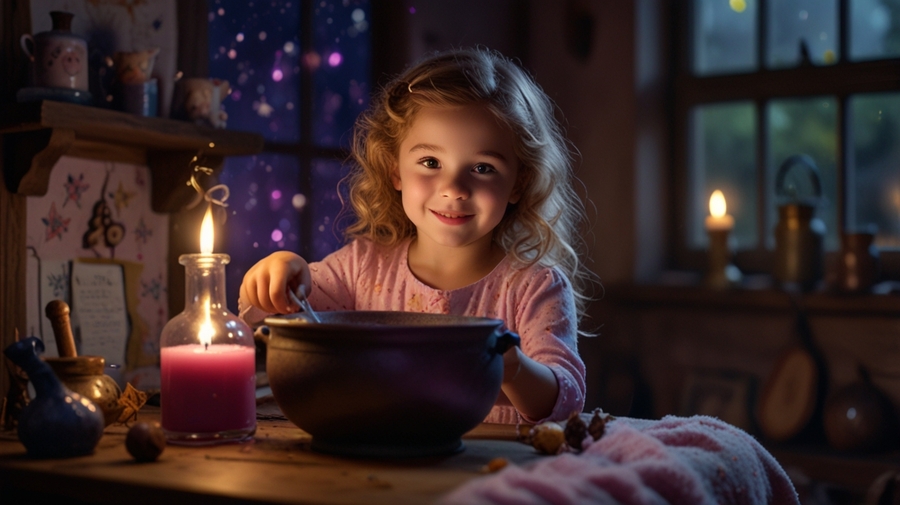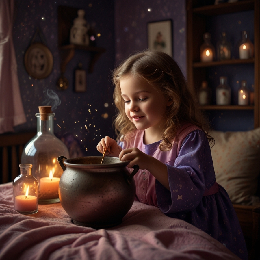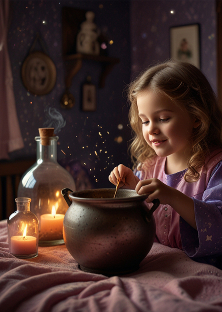 промпт: a realistic photo of a 5-year-old girl sitting on her bed in her cozy bedroom. She is deeply engaged in mixing a potion in a small, whimsical cauldron. The scene should be magical and enchanting, with stars and sparks emerging from the cauldron, illuminating her joyful expression. The girl should have curly hair. Capture her expression of wonder as she stirs the potion. Use warm, soft lighting to create a cozy atmosphere in the room, with a slight glow coming from the cauldron to highlight the magical elements. The image should evoke feelings of joy, creativity, and wonder, capturing the essence of childhood imagination and the magic of potion making. Results should contain pink, purple, blue and gold colours