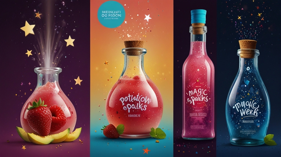 промпт: series of 2 different posters for «magic sparks» a brand specializing in children’s drink-making magic potions. The first poster: a heart shaped bottle with magic potion surrounded by magical sparkles, stars and slices of ingredients like strawberry, banana, vanilla. The second poster: a star shaped bottle with magic potion surrounded by magical sparkles, stars and slices of ingredients like melon, raspberry, coconut. Posters should contain text: «Potion of the Week». The designs should be colorful, playful, and imaginative, appealing to a young audience. Results should contain pink, purple, blue and gold colours. Gradient, magic background.