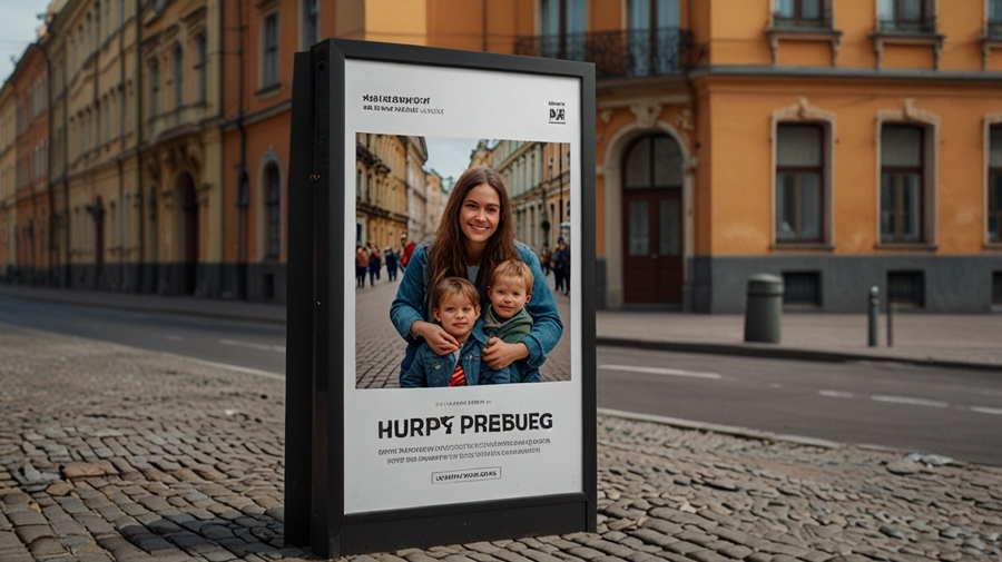 промпт для мокапа: realistic photo mockup showcasing a series of 3 posters on the street of Saint Petersburg. Add children and families interacting with the posters—taking photos.