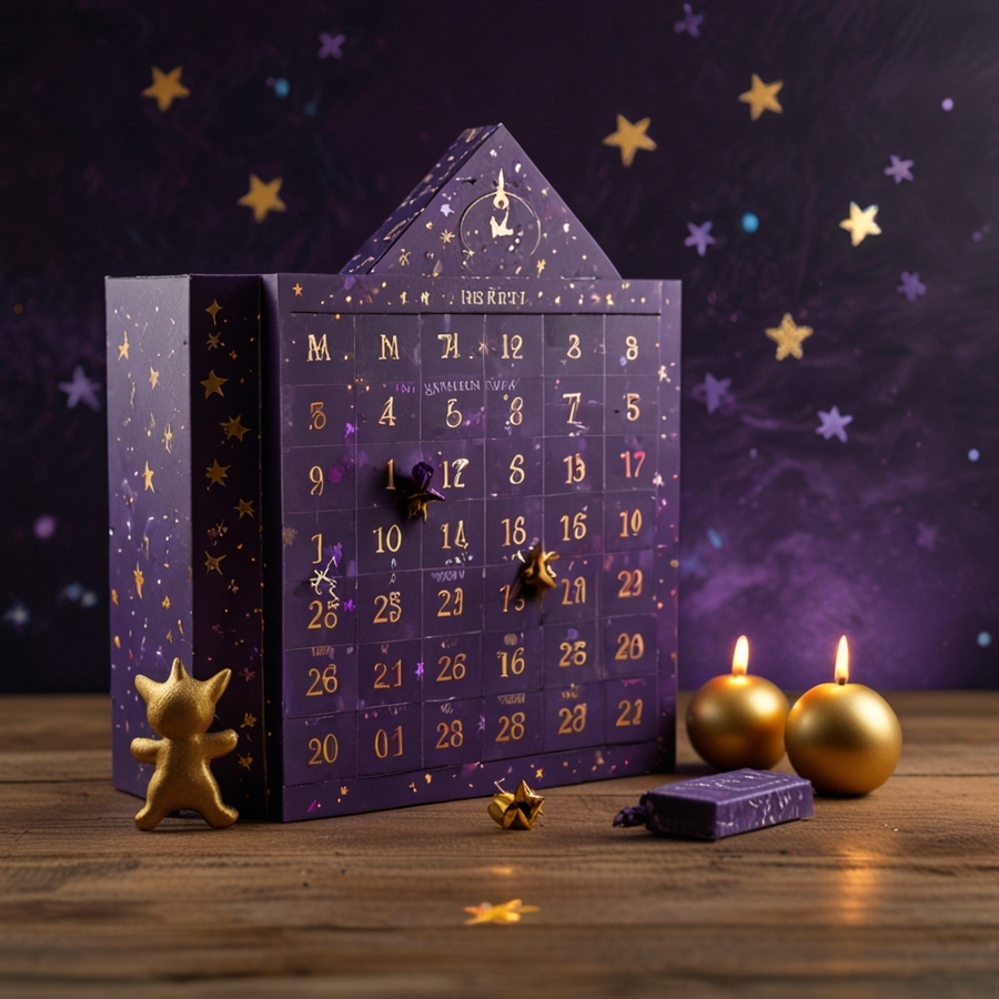 промпт: Advent calendar for 31 days stands on a wooden table against a background of purple bricks. The material for the calendar is cardboard, with small cuts visible for each of the days. Its box depicts a witch flying on a broom against a purple sky with a large number of stars. In her hand, the witch holds a bright glowing and shiny golden-colored potion.
