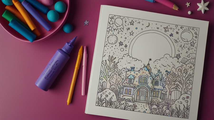 промпт: a realistic photo of coloring book for children lying on the table in the children’s room. Top view without perspective distortion. Illustrations should contain cute potion bottle in various shapes and sizes, each filled with liquids, bubbles and stars. Results should contain pink, purple, blue and gold colours.