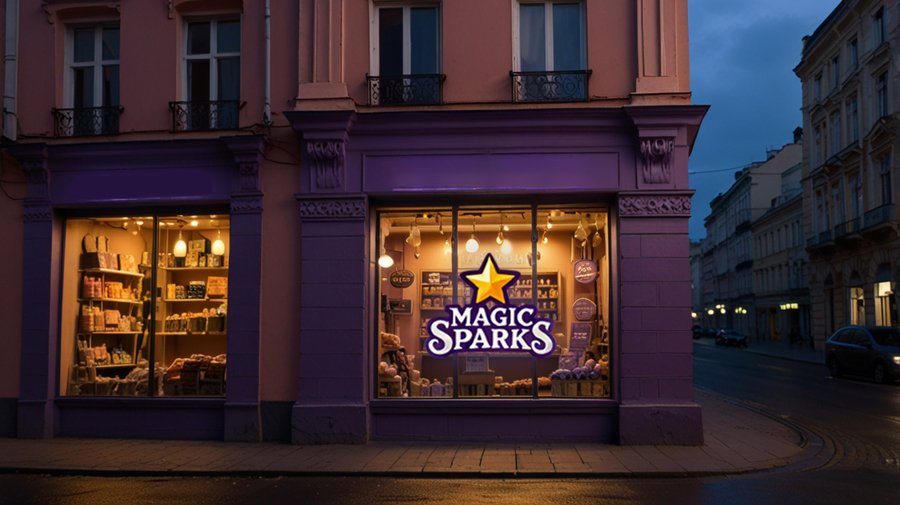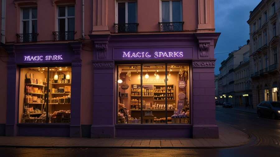 промпт: A purple brick retail store sits on the evening streets of St. Petersburg. A square sign above the main door reads «Magic Sparks». It has large and slightly old-fashioned windows from which light can be seen. This building is a store of potions with shines.