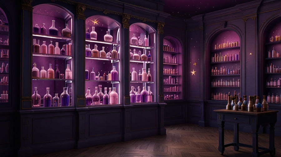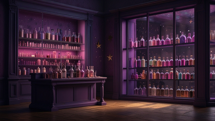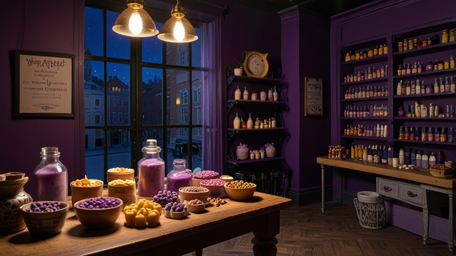 промпт: There are close look table area for making your own sweets: there are gloves, necessary ingredients, glitter, fruit and small bottles with cork lids that look like potions. On the walls there are instructions on how to make potion sweets. This table is located in purple brick commercial store is located in the evening streets of St. Petersburg.