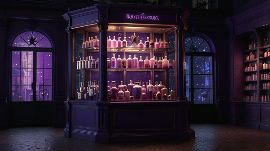 промпт: a realistic photo of a purple shop with a star on the roof in Saint Petersburg. The shop has a transparent display case in which various flasks and test tubes with potions are visible. The overall atmosphere of the image should be bright, colorful, magic, and imaginative, appealing to a young audience. Results should contain pink, purple, blue and gold colours.