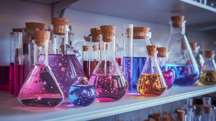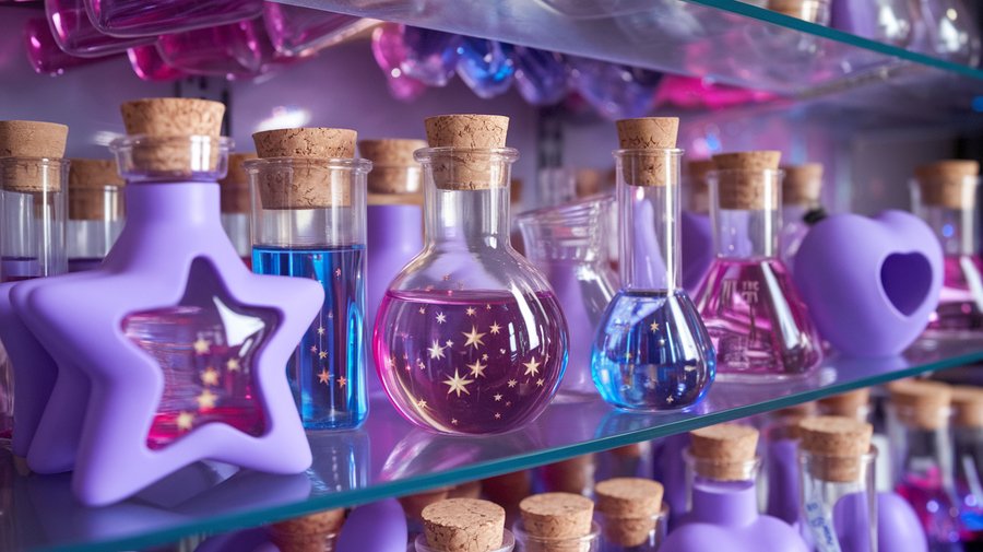 промпт: a realistic photo of matte flasks and test tubes with magic shiny liquids with stars inside closed with cork stoppers displayed on a store shelf. Flasks and test tubes should be of different sizes and shapes like star, sphere and heart. The overall atmosphere of the image should be magic, appealing to a young audience. Results should contain pink, purple, blue and gold colours.