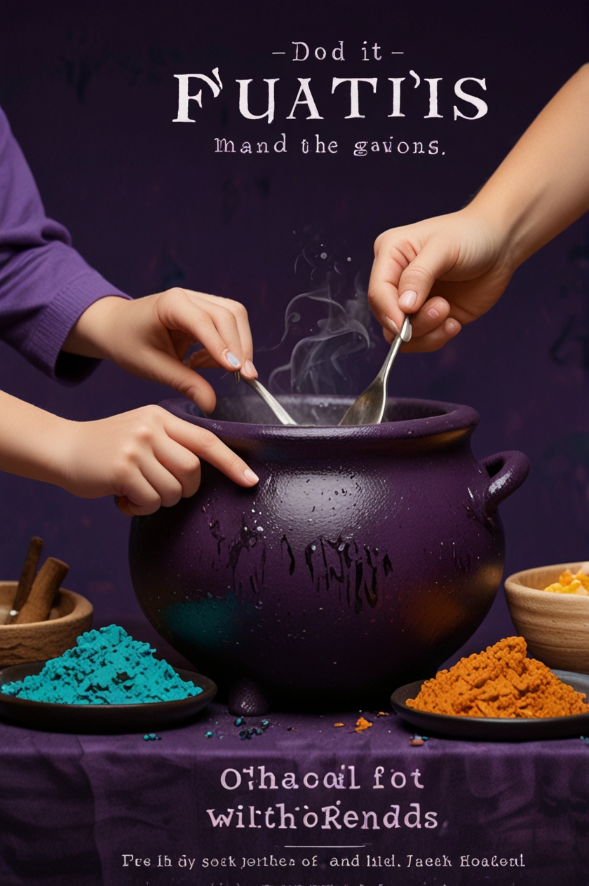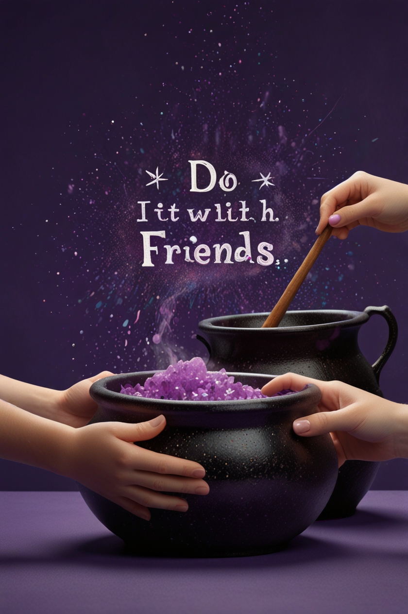 промпт: Create a poster that shows two children’s hands creating potions on the purple background: one hand are pouring glitter into cauldron and other holds magic spoon. Potion looks gloomy and amusing. Text under cauldron reads 'Do it with friends'
