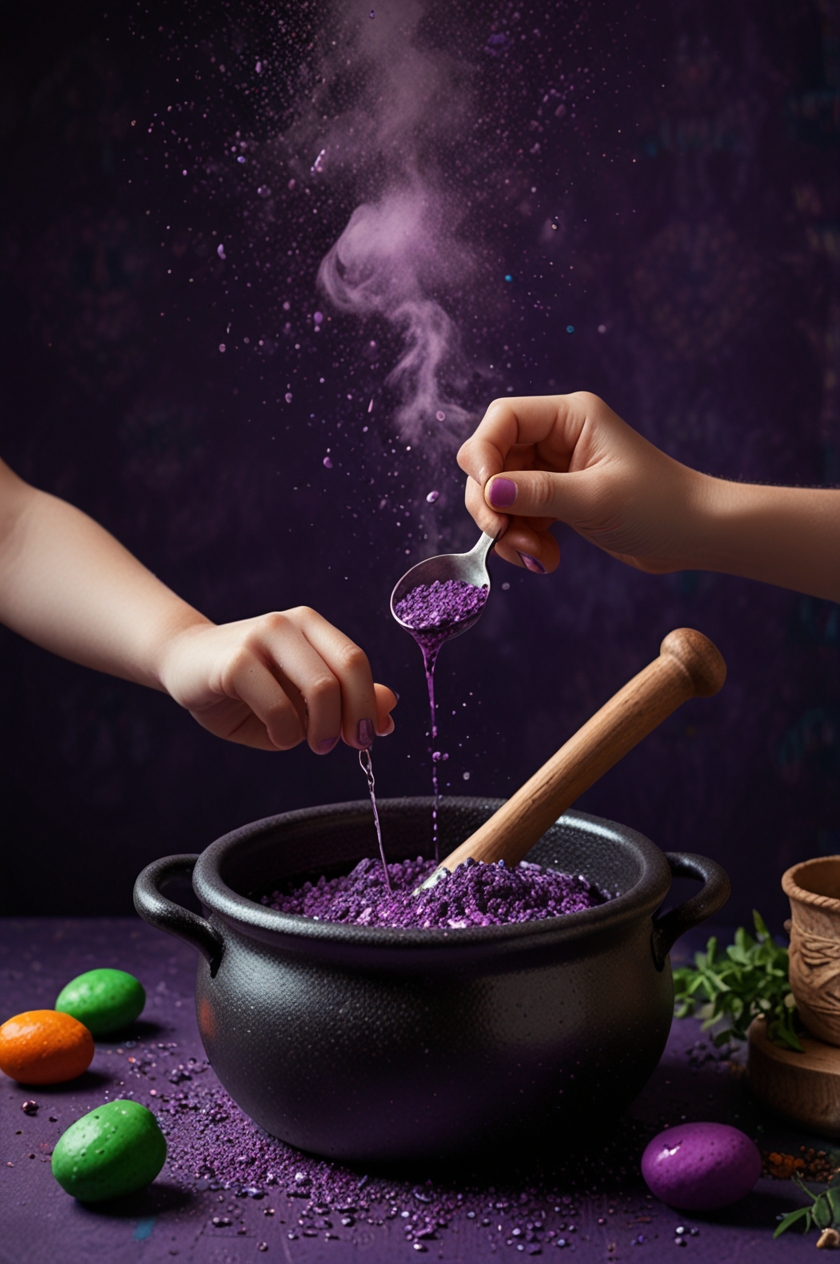 промпт: Create a poster that shows two children’s hands creating potions on the purple background: one hand are pouring glitter into cauldron and other holds magic spoon. Potion looks gloomy but tasty. Text under cauldron reads 'Just try it'