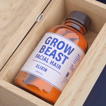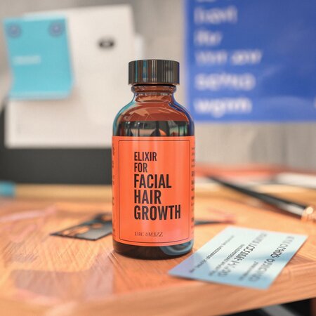 Промпт: elixir in an orange bottle that helps grow facial hair photorealistic