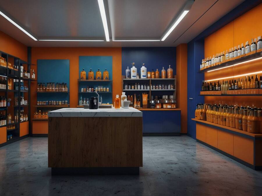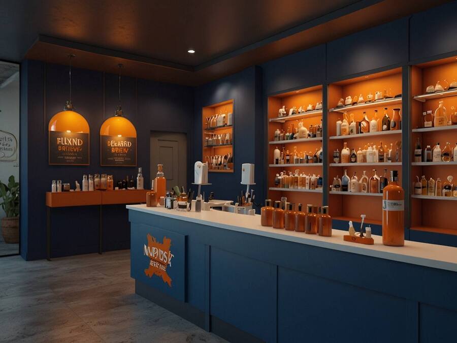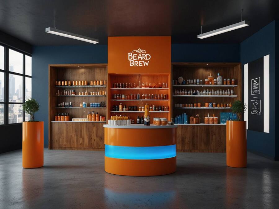 Промпт: a shop for a company that sells elixirs in an orange bottles that helps grow facial hair named beard brew, use orange, white and blue colours