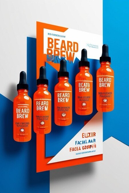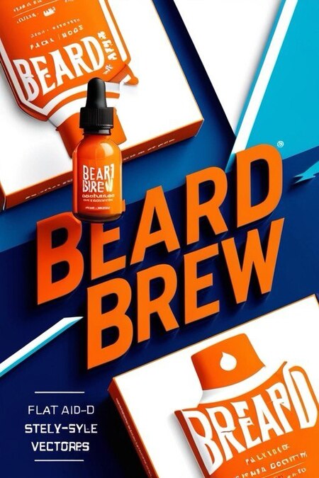 Промпт: vibrant, professional graphic design featuring flat, 3D-style vector art, showcasing a poster for Beard Brew, a company specializing in elixirs that aid in facial hair growth, packaged in distinctive bright orange bottles, predominantly rendered in a bold, electric orange hue, accented with crisp white and calming blues, evoking a sense of modernity and approachability, with meticulous attention to detail, clean lines, and geometric shapes, all set against a contrasting background that makes the brand’s vibrant colours pop, effectively capturing the essence of a premium, high-quality product that exudes confidence and sophistication.