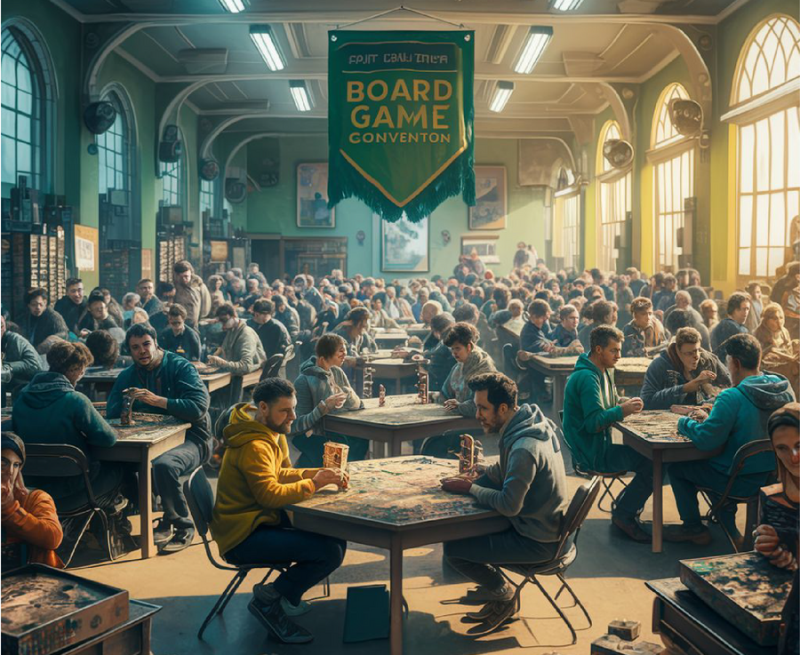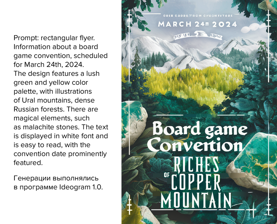 Prompt: A huge banner sign. On the banner there is information about a board game convention, scheduled for March 24th, 2024. The design features a lush green and yellow color palette, with illustrations of Ural mountains, dense Russian forests. There are magical elements, such as malachite stones. The text is displayed in white font and is easy to read, with the convention date prominently featured. the name of the company is Riches of Copper Mountain.