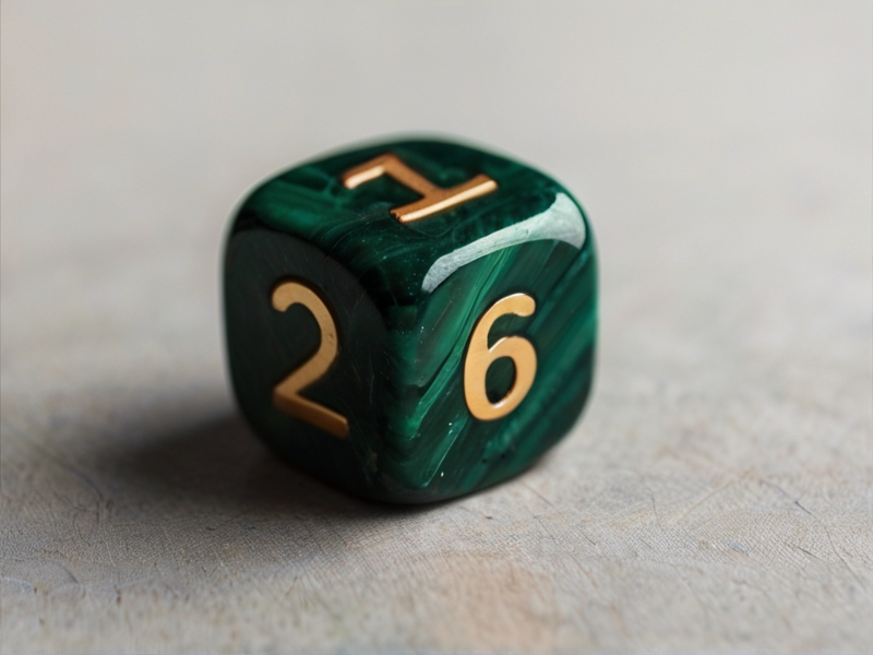 Prompt: one numeral dice made of malachite is lying on a solid white background