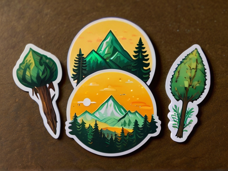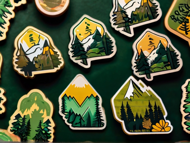 Prompt: a pile of stickers with with intricate details, mountains, forest and magic, in green and yellow color pallet, on a solid background