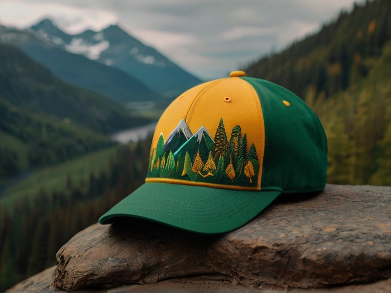 Prompt: a cap with with intricate details, mountains, forest and magic, in green and yellow color pallet, on a solid background