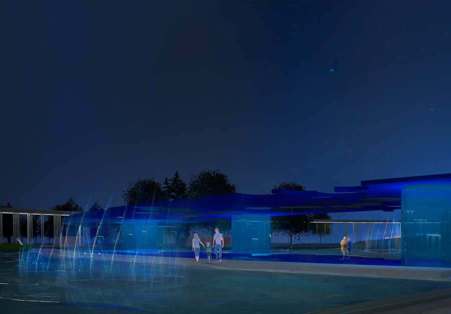 В холодное время года водоем переоборудуется в каток, павильон у воды и пространство под возвышением на центральной площади работают как технические помещения с комнатой для переодевания и аренды коньков.