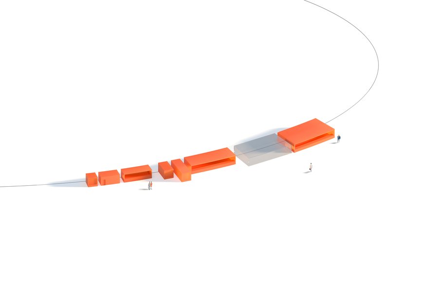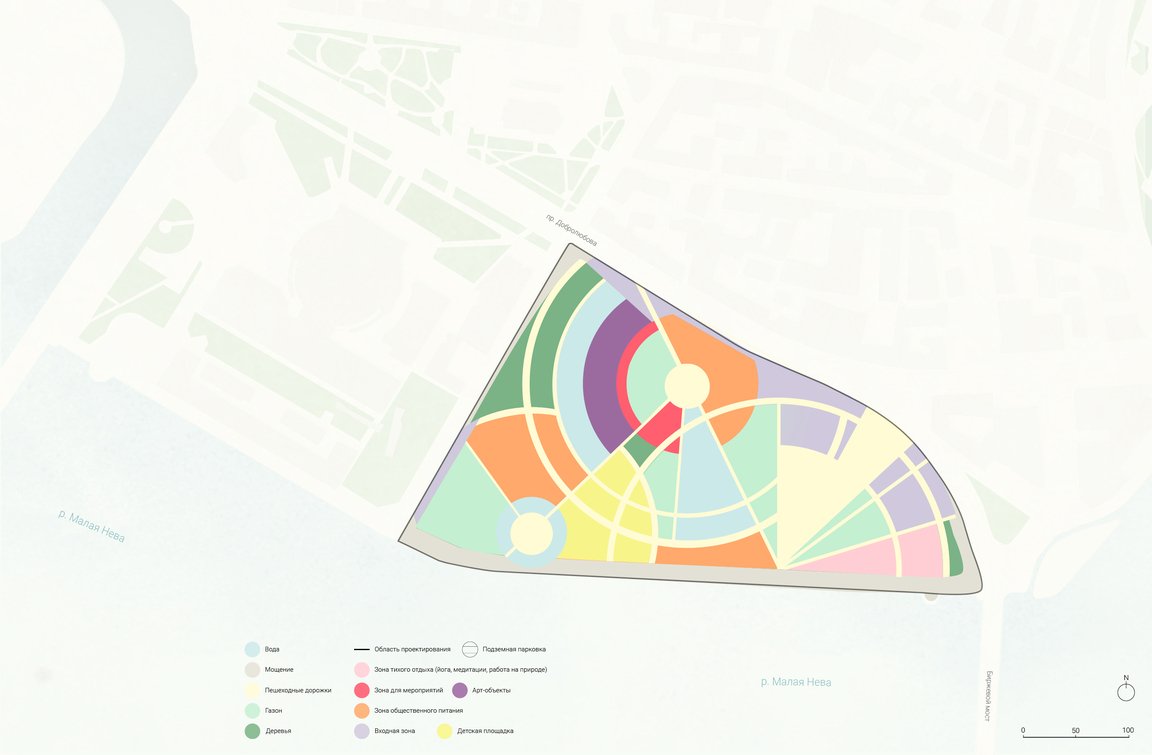 Ритм колонн является формообразующим элементом паркового пространства. Цвет визуально обозначает зону для тихого отдыха и коворкинга.