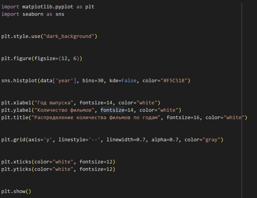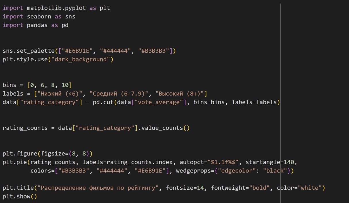 файл загружается в pandas с помощью pd.read_csv («top_rated_movies.csv»). дата выхода фильма (release_date) преобразуется в формат datetime (pd.to_datetime), используя параметр errors='coerce', чтобы избежать ошибок. из даты выхода извлекается год (data['year'] = data['release_date'].dt.year). Подсчитываются пропущенные значения в датафрейме (data.isnull ().sum ()).