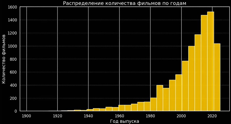 На основе графика распределения количества фильмов по годам можно сделать несколько выводов: