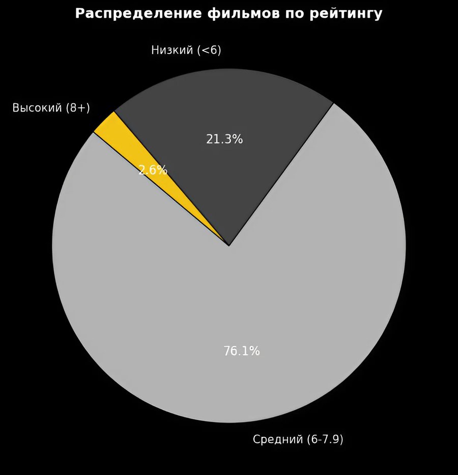 Это ожидаемо, так как большинство фильмов попадают в диапазон «средних» оценок, отражая сбалансированное распределение оценок зрителей.