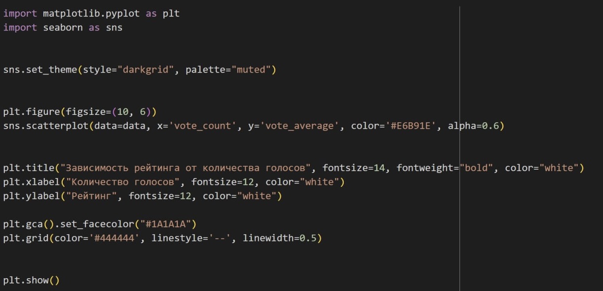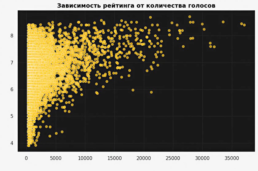 В области с большим количеством голосов (например, более 10 000) разброс рейтингов значительно уменьшается. Это говорит о том, что чем больше голосов у фильма, тем более объективный и устойчивый его рейтинг.