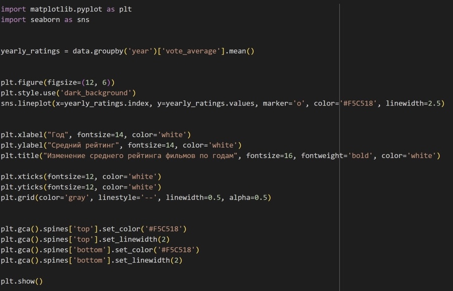 Этот график показывает изменение среднего рейтинга фильмов по годам и позволяет сделать несколько выводов:
