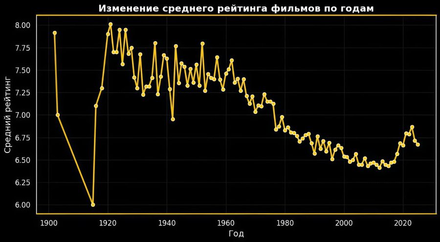 В последние годы (с 2010-х) наблюдается рост среднего рейтинга, что связано с развитием потоковых сервисов, улучшением качества контента и увеличением количества нишевого авторского кино.