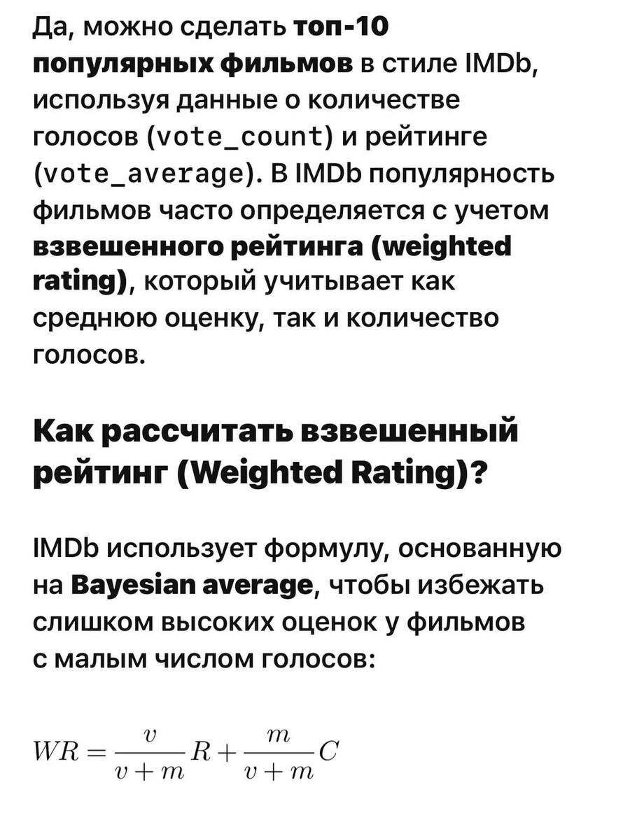 Для своего проекта я использовала Chat-GPT-4-Turbo. Он помог мне в написании частей кодов, придумывании формулы «Взвешенного рейтинга» и вставлении её в код, помог с исправлением ошибок в кодах, которые возникали.