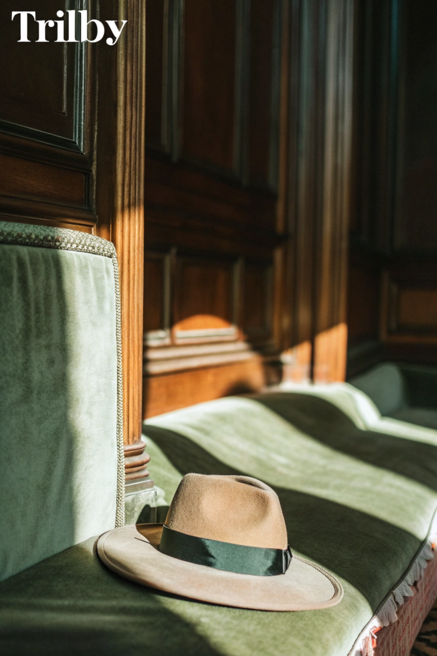 Promt: Generate a promotional poster for the «Trilby» hat brand with a luxurious and sophisticated aesthetic. The poster should feature a single, impeccably crafted Trilby hat placed in a dimly lit, opulent setting with rich textures. The lighting should be dramatic, and the overall style should be timeless and elegant. Use a limited color palette with dark tones and metallic accents.