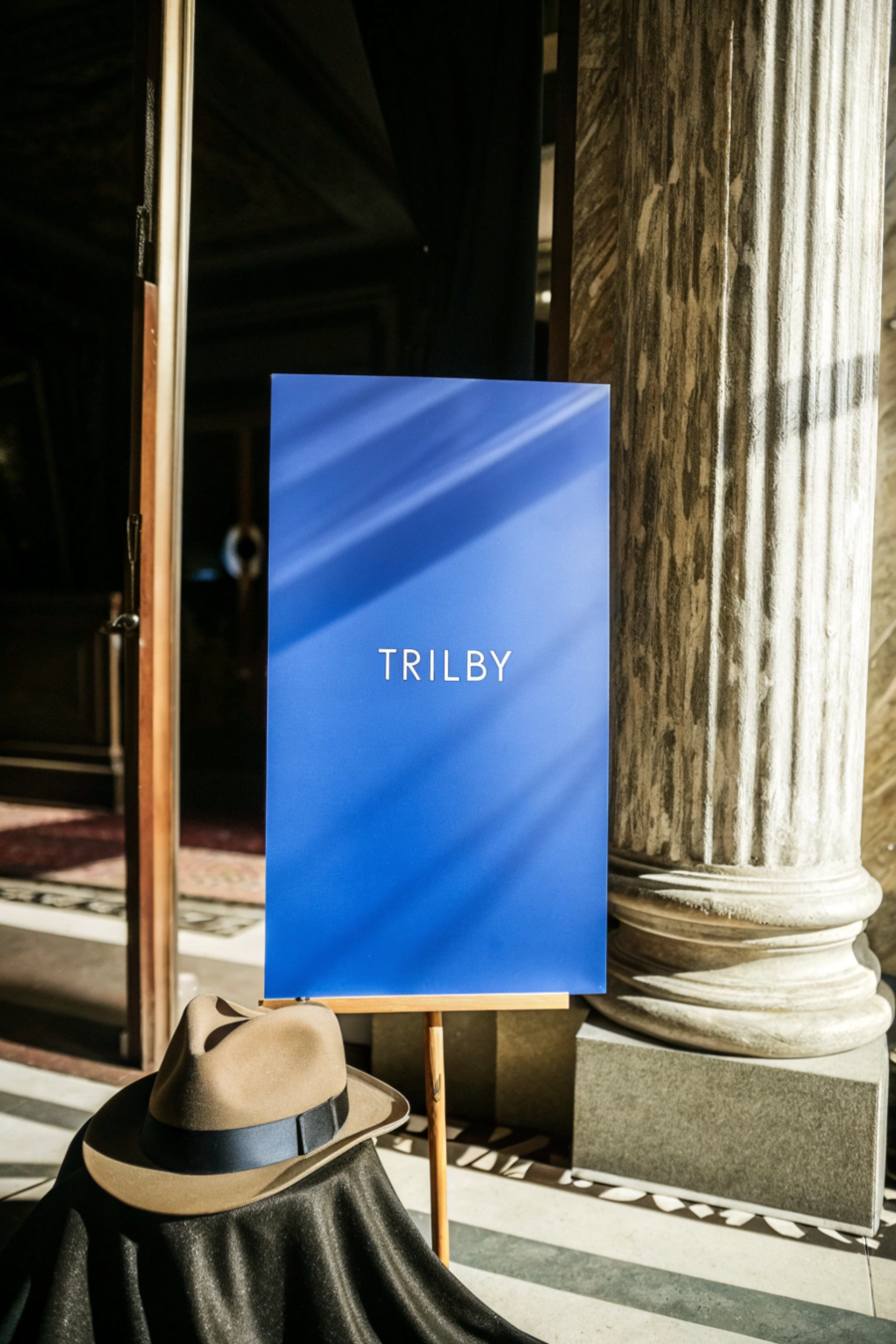 Promt: Generate an image of a «Trilby» hat shop hat box that balances luxury and whimsy. The box should be crafted from high-quality materials with elegant design details, and feature a base color with playful accents. If a hat is visible, it should have prominent ears, wings, or eyes. The «Trilby» brand name should be clearly displayed using a sophisticated typeface and logo. The overall feel should be both sophisticated and fun.