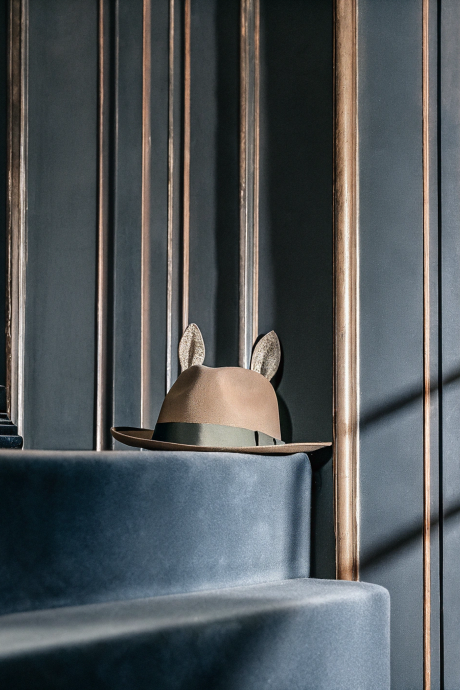 Promt: Generate an image of the ‘Trilby’ hat shop fitting room. The room should have a luxurious feel with high-quality materials, elegant furnishings, and a large statement mirror. Display a variety of fun and whimsical hats, including some with prominent ears, wings, and eyes. The lighting should be soft and highlight both the sophisticated design and the playful details. The overall style should balance luxury with a fun and relaxed atmosphere.