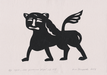 Львы — один из самых часто встречающихся образов резной декорации Дмитриевского собора во Владимире. Символы власти и часть ветхозаветной мифологии, для меня они — домашние звери родного города. За ними я наблюдала все детство и большую часть сознательной жизни. Немного странные и неловкие, расплывающиеся в чудноватой улыбке и совсем не жуткие. Так и норовят убежать с листа бумаги и наследить кляксами.