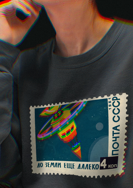 Выполненные вручную иллюстрации отсылают к серии советских марок «Космическая фантастика» 1967 года.