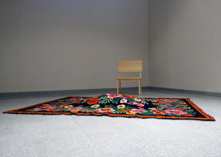 Видео экспонируется в одном зале с работой Леонида Тишкова «Коврики матери»
