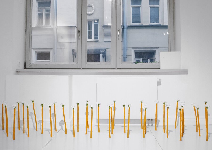 Инсталляция «Поле» экспонируется в одном зале с видео перформанса Карины Батраченко «Там, где тишина становится местом»