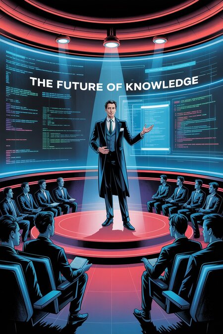 A cinematic digital illustration of а lecture taking place in a futuristic auditorium. A charismatic male lecturer in a tailored black suit stands confidently on a circular red stage bathed in focused spotlights, gesturing towards a holographic projection of complex data streams. The semi-circular auditorium is filled with diverse audience members seated in sleek LED-lit chairs, with neon blue accents highlighting the architectural design. Behind the lecturer, a massive curved screen displays abstract patterns and cascading code, adding to the polished cyberpunk aesthetic and immersive atmosphere.