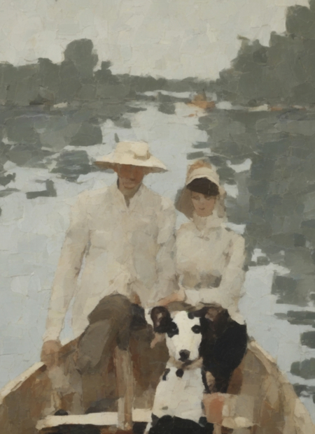 photo collage in Nicolas de Stael stylea, a man and a woman near them, a dog in a boat
