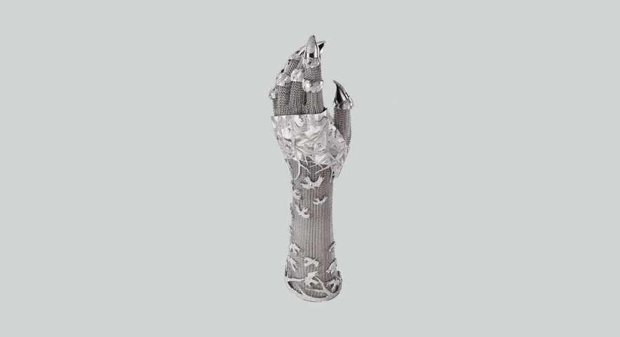 Если мы будем говорить о ювелирном дизайнере Шоне Лине, то не сможем не отметить его перчатку из белого золота 750 пробы, сочетающую в себе прочность брони и грацию шелковой печатки с кружевами. Изящные птицы обрамляют кольчужный рукав, вновь прослеживается игра между рыцарским и феминным.