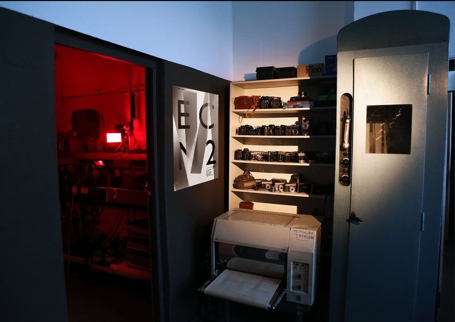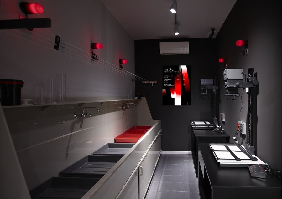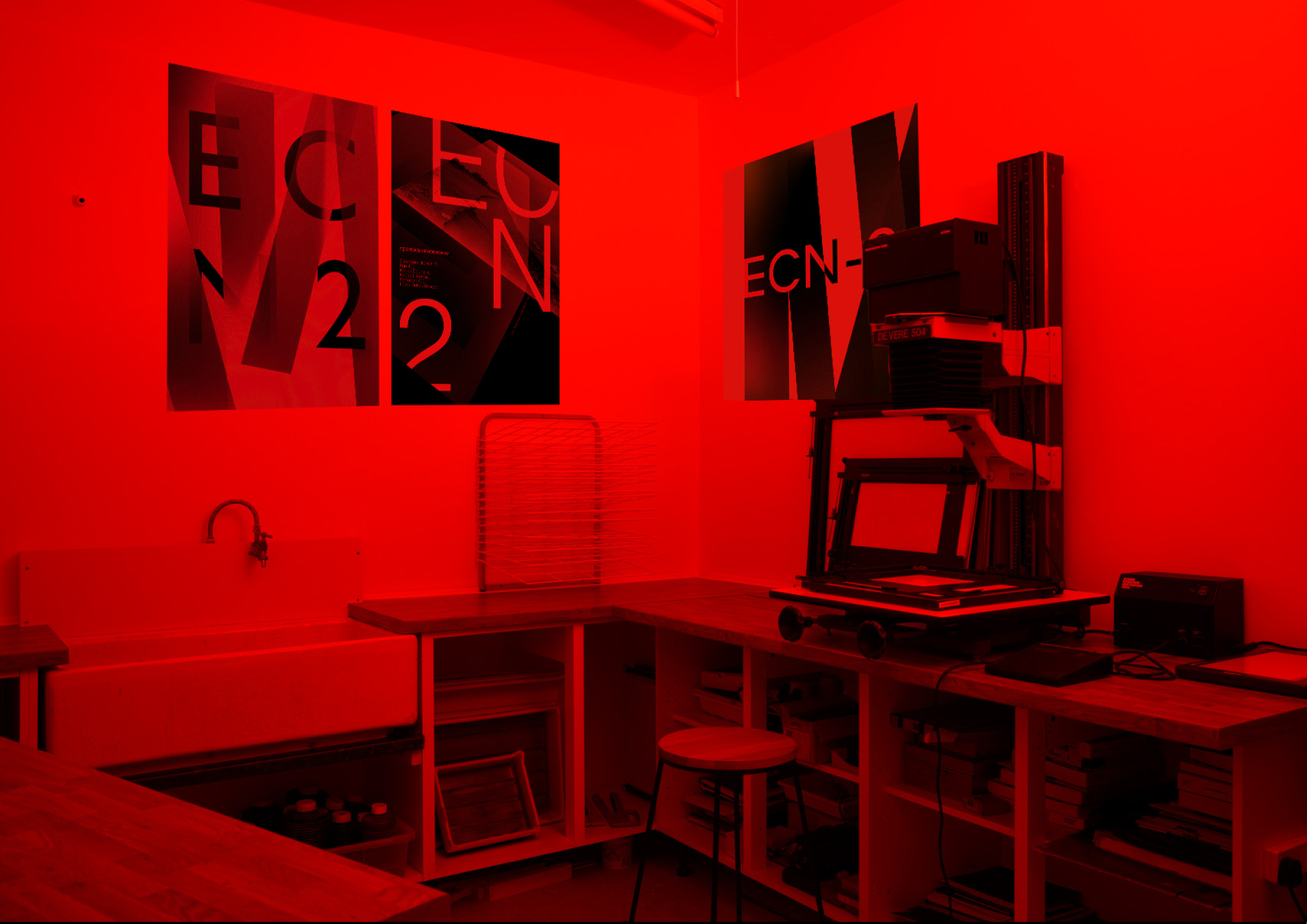 Нейросеть: Ideogram Промпт: create a photolaboratory with a minimalistic style in red, white, black and grey colours named ECN-2