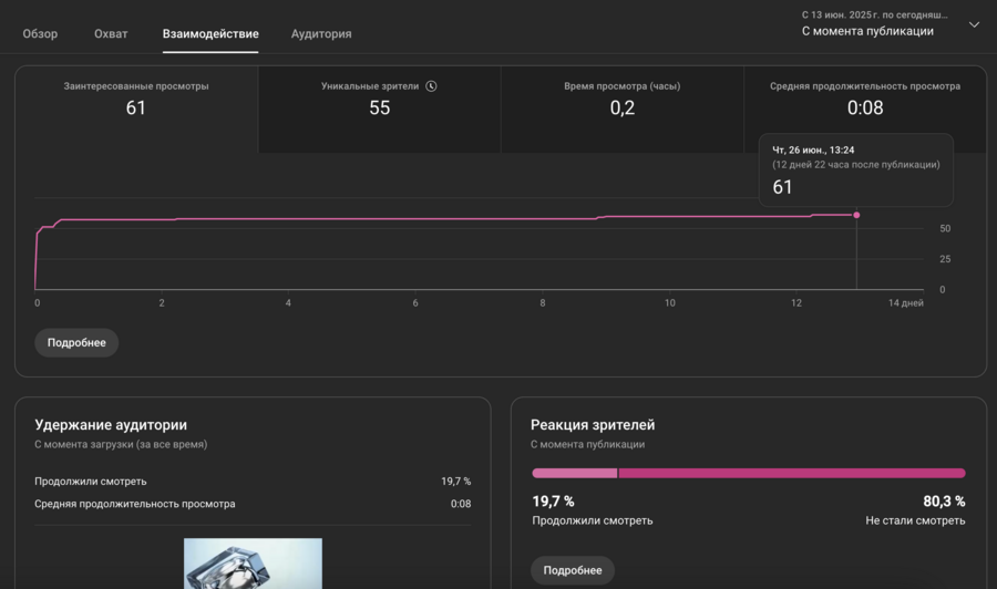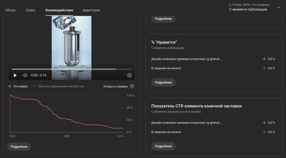 Видео набрало 292 просмотра, из которых 61 оказался заинтересованным, что соответствует 19,7% RR. На графике видно, что интерес аудитории снижался постепенно. Работа получилась неплохой, однако анимации, созданные нейросетями, пока уступают по качеству реальным съёмочным креативам. Учитывая высокую конкуренцию в этом сегменте, видео не смогло произвести должного впечатления на пользователей.