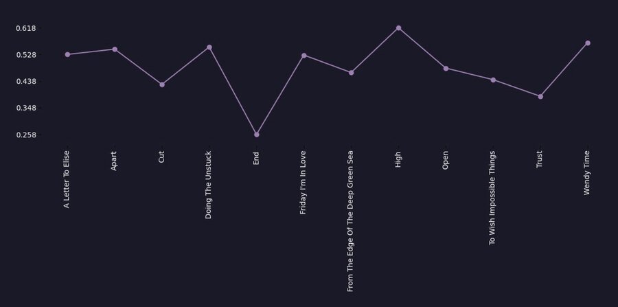 Для того, чтобы исправить ошибки в кодах и скорректировать их, была использована нейросеть Chat GPT4. ⎯⎯⎯⎯⎯⎯⎯⎯⎯⎯⎯⎯⎯⎯⎯⎯⎯⎯⎯⎯⎯⎯⎯⎯⎯ Я сделала выводы исходя из этого графика и для дальнейшего взялась рассматривать два альбома подробнее — Wish и Disintegration.