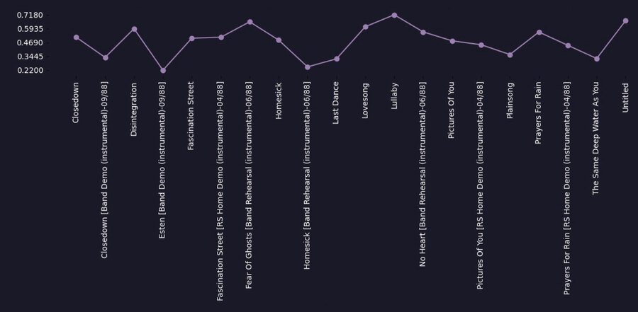 В первом графике я отсортировала 35 песен по популярности, чтобы узнать, какие композиции получили больший охват и признание среди аудитории. На первом месте оказалась песня Friday i’m in Love из альбома Wish. Призерские места заняли две композиции из альбома Disintegration — Lovesong и Pictures of you.