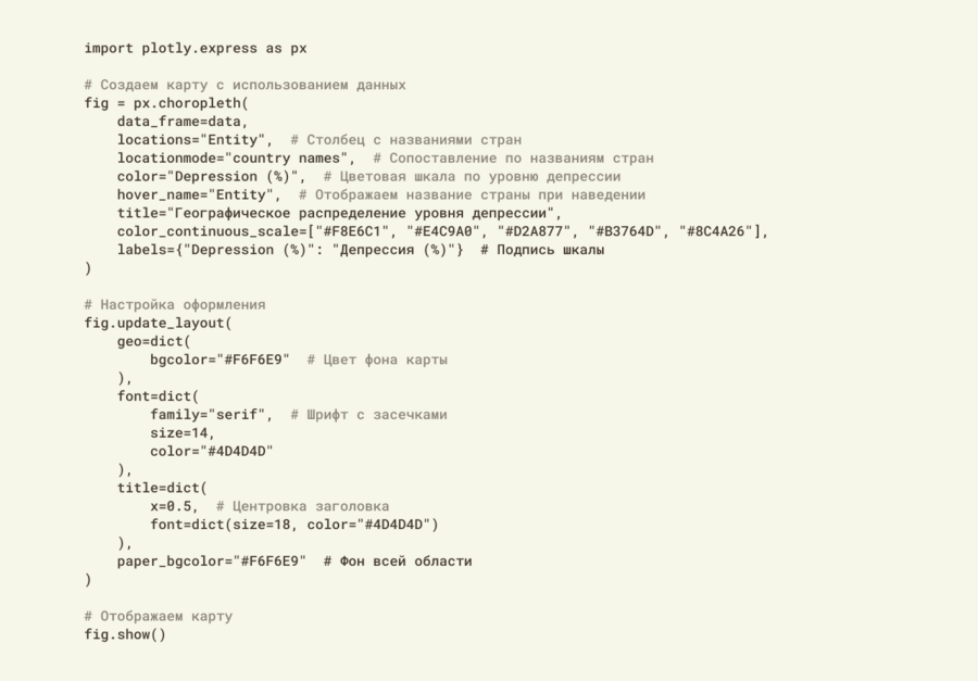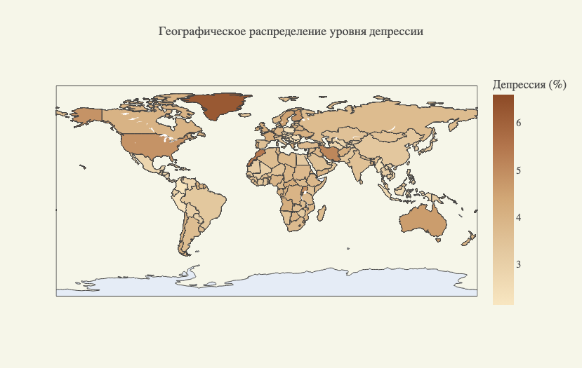 Карта демонстрирует географическое распределение уровня депрессии среди стран мира. Использование цветовой градации позволяет выделить регионы с высоким и низким уровнем депрессии, что помогает выявить глобальные тренды. Этот анализ важен для определения приоритетных регионов для психологической поддержки.