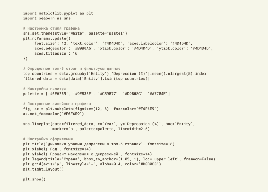 Линейный график показывает изменения уровня депрессии в пяти странах с наибольшими средними показателями. Он иллюстрирует, как уровень депрессии изменялся с течением времени, помогая понять долгосрочные тенденции и давая возможность оценить факторы, влияющие на рост или спад показателей.