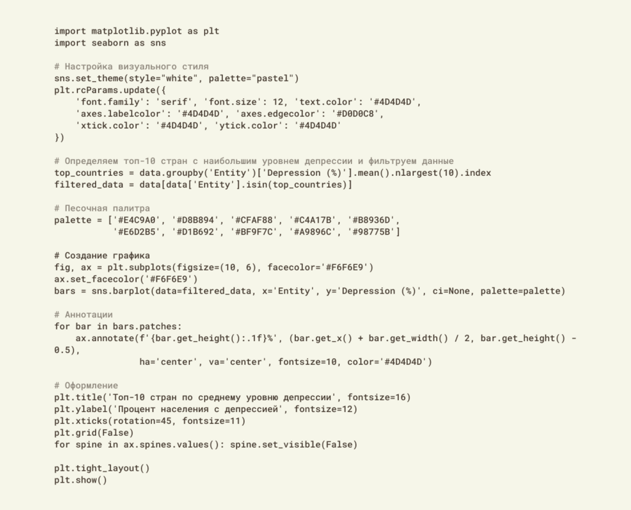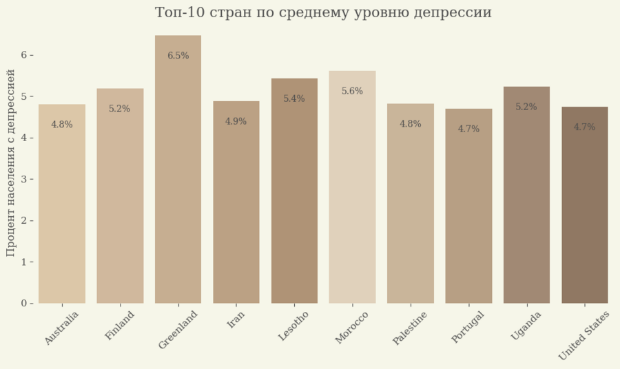 Столбчатая диаграмма показывает страны с наивысшими средними уровнями депрессии. Эти данные дают оценить масштабы проблемы в отдельных странах и сравнить их между ними.