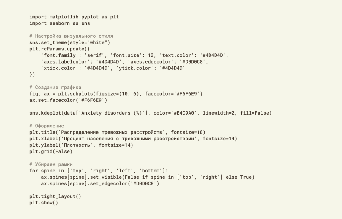 Сначала данные были считаны в DataFrame с использованием функции pd.read_csv (). Основное внимание было уделено таким столбцам, как Entity, Year, Depression (%), Anxiety disorders (%) и другие, которые содержат информацию о распространенности психических расстройств.