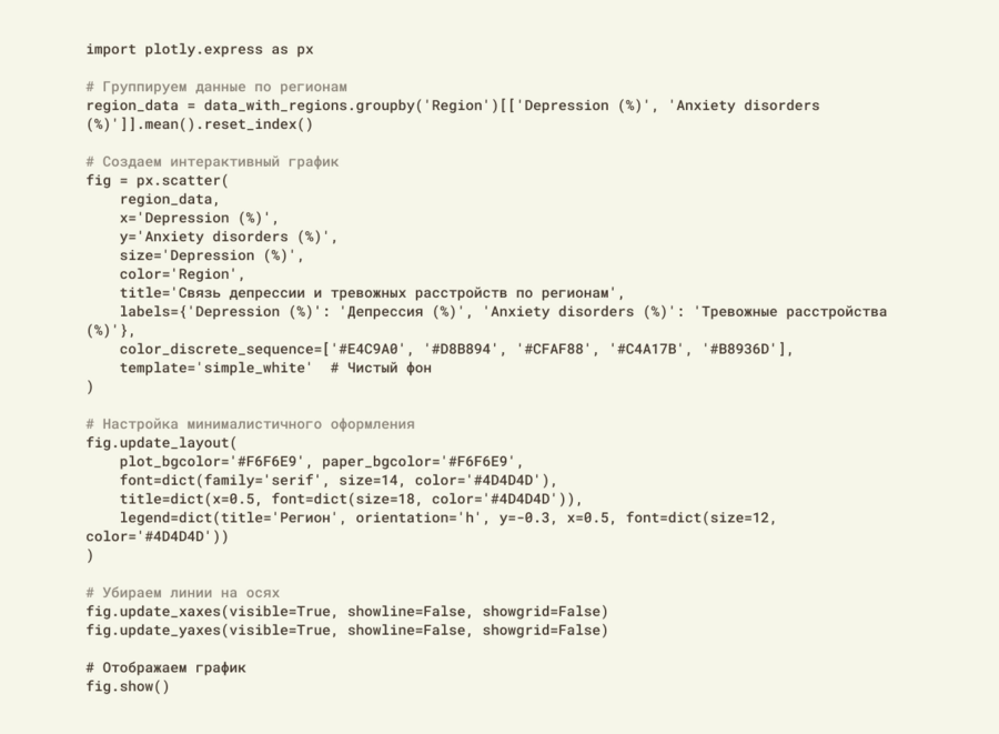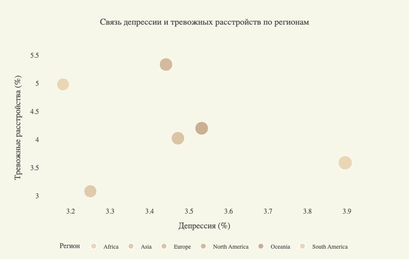 Точечный график показывает корреляцию между уровнями депрессии и тревожных расстройств в разных регионах мира. Положения точек зависят от уровня депрессии, что помогает выявить регионы с наиболее острыми проблемами психического здоровья.