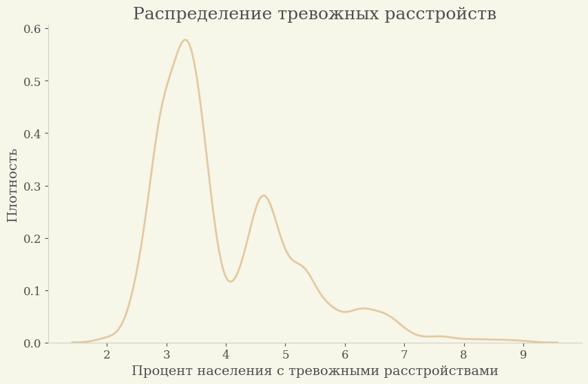 Линейный график отображает распределение уровней тревожных расстройств на уровень населения. Он подчеркивает, какие значения встречаются чаще всего, что важно для понимания, насколько равномерно распределены тревожные расстройства.