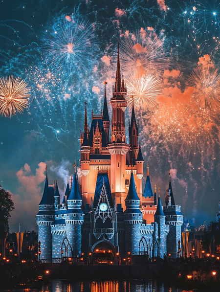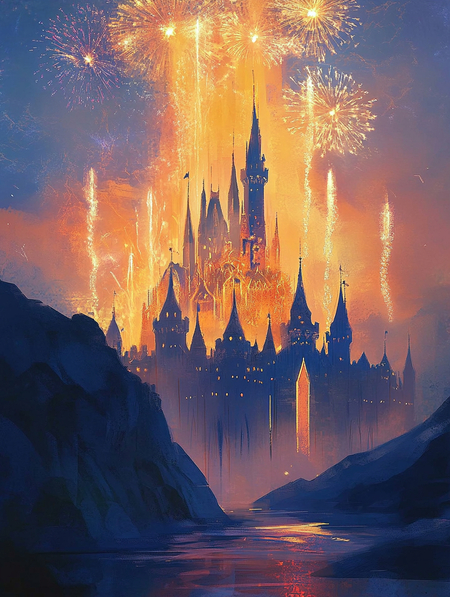 Для генерации обложки я использовала нейросеть Midjourney. Prompt: A modern cover that reflects Disney movie aesthetics, a backdrop of a castle with fireworks, utilizing vibrant and rich colors.