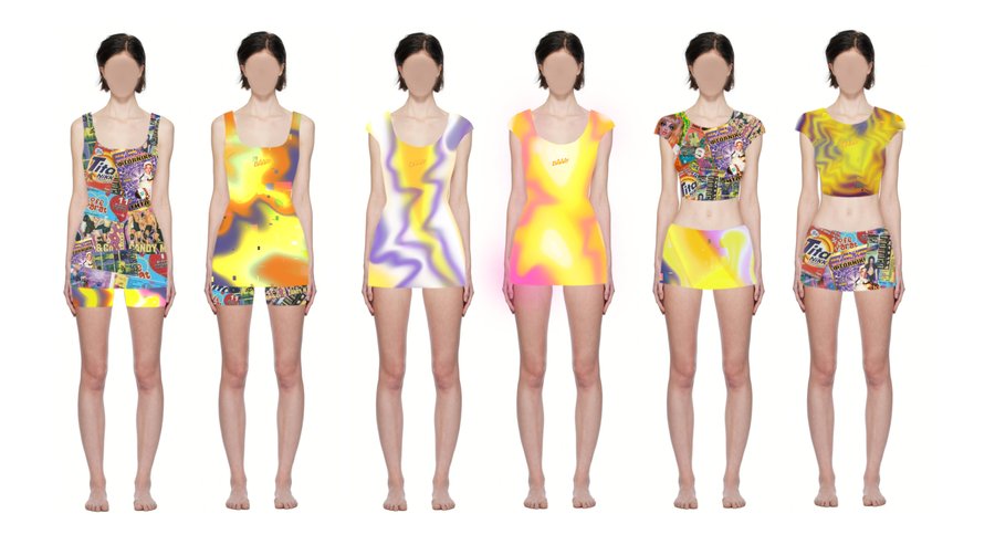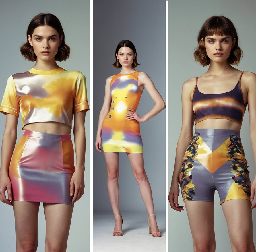 Промт — Generate an image of THREE FULL-BODY MODELS with Slavic features and bob hairstyles (short, chin-length cuts). The models should be standing together, each wearing different vibrant and print-heavy outfits. The first model wears a FORM-FITTING short dress with a round neckline and short sleeves, featuring a blurred gradient print transitioning from yellow to pink with glowing highlights. The second model is dressed in a FORM-FITTING mini skirt and a cropped top, both showcasing vivid, colorful, blurred prints with seamless color transitions. The third model wears a FORM-FITTING short dress with thin straps, paired with tight shorts underneath, both designed with bright, dynamic gradient prints. THE CLOTHING SHOULD BE KNITTED AND FIT TIGHTLY TO THE BODY, accentuating the models’ figures. All prints must have a blurred effect, with colors smoothly blending into one another, reflecting a bold and modern aesthetic. THE MODELS SHOULD BE DISPLAYED IN FULL BODY VIEW, clearly showcasing all three outfits together in one cohesive visual composition.