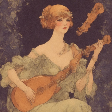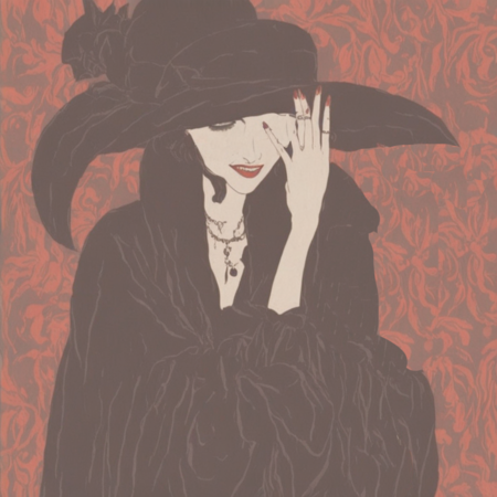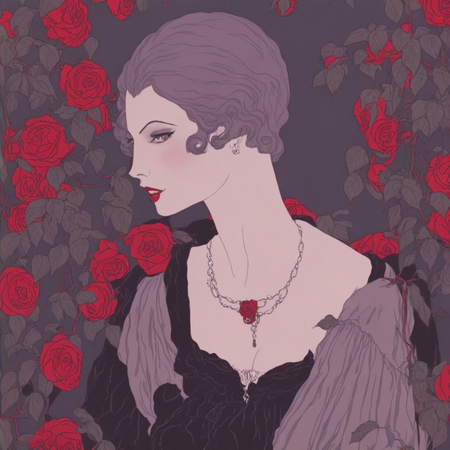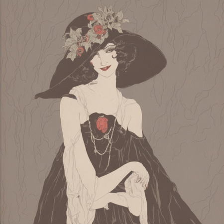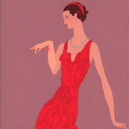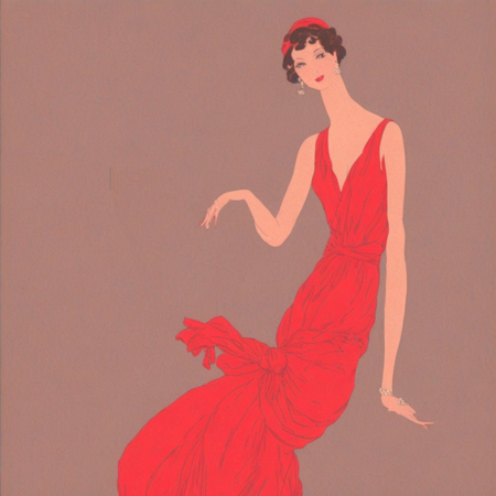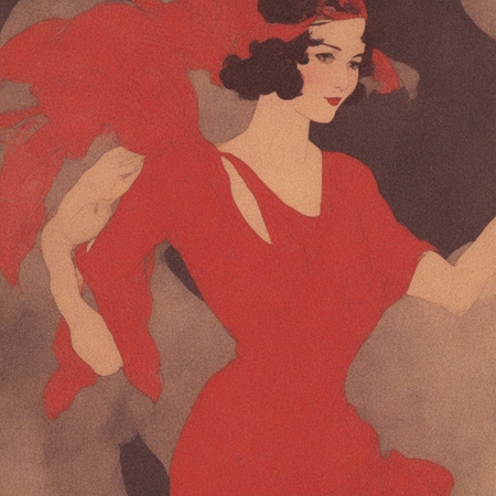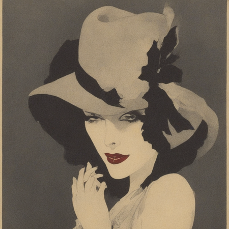 После повторного обучения с дополнением датасета изображения стали реалистичнее, особенно в проработке лицевых черт. При этом уровень детализации локонов снизился, что, напротив, сыграло на пользу — такая стилизация больше соответствует визуальному языку арт-деко, где преобладают обобщённые формы и графичность линий.